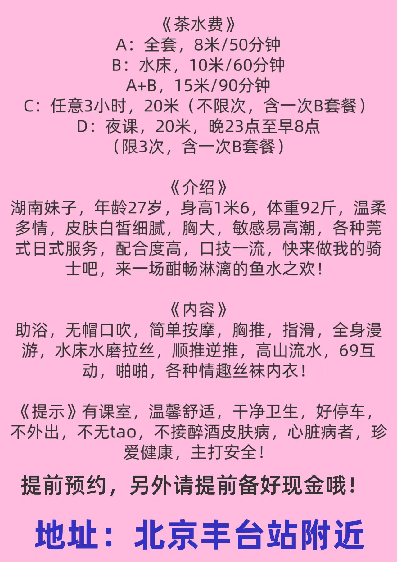 凡是有要求路费/定金/保证金/照片验证/视频验证等任何提前付费的行为,千万不要上当。同时也请注意仙人跳,在寻欢前不要露富和带过于贵重随身物品。本站为分享信息并不对寻欢经历负责,碰到有问题的信息,请及时举报给我们删除信息。